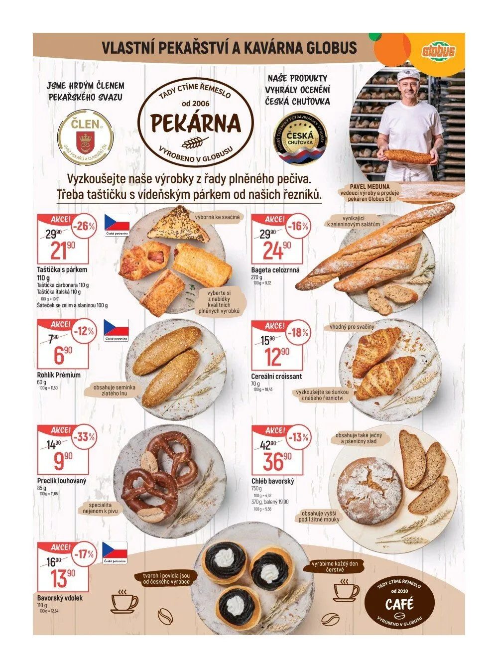 V letáku najdete také akční nabídky, jako je rohlík prémium, celozrnná bageta, cereální croissant s obsahem semínek zlatého lnu, a bavorský vdolek. Nezapomeňte vyzkoušet náš čerstvý chléb bavorský, který je ideální ke svačině. Všechny naše produkty jsou vyráběny denně z kvalitních surovin, včetně tvarohu a povidel od českého výrobce. Přijďte si vychutnat naše delikatesy!