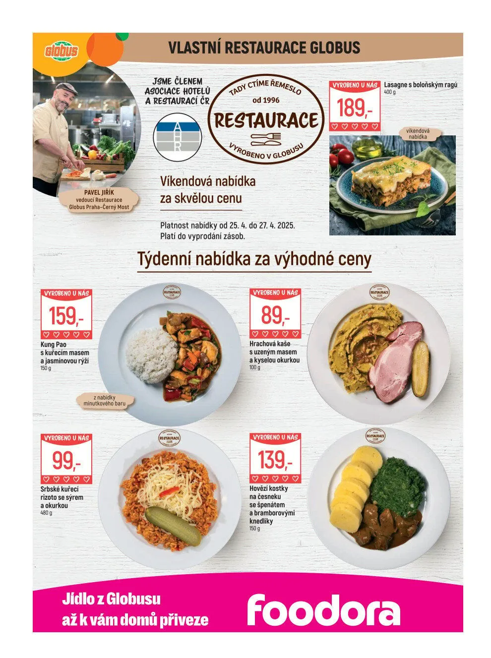 V letáku obchodu Globus najdete skvělou nabídku pokrmů z vlastní restaurace. Mezi nimi se objevuje Kung Pao s kuřecím masem a jasmínovou rýží za 159 Kč, nebo srbské kuřecí rizoto se sýrem a okurkou za 99 Kč. Nezapomeňte také na víkendovou nabídku, která platí od 25.4. do 27.4.2025, a zahrnuje lasagne s boloňským ragú za 189 Kč. Pro milovníky tradiční kuchyně je připravena hrachová kaše s uzeným masem a kyselou okurkou za 89 Kč. Všechny pokrmy jsou vyrobeny u Nág a můžete si je objednat i přes Foodora, která vám je přiveze až domů. Neváhejte a využijte této výhodné nabídky!