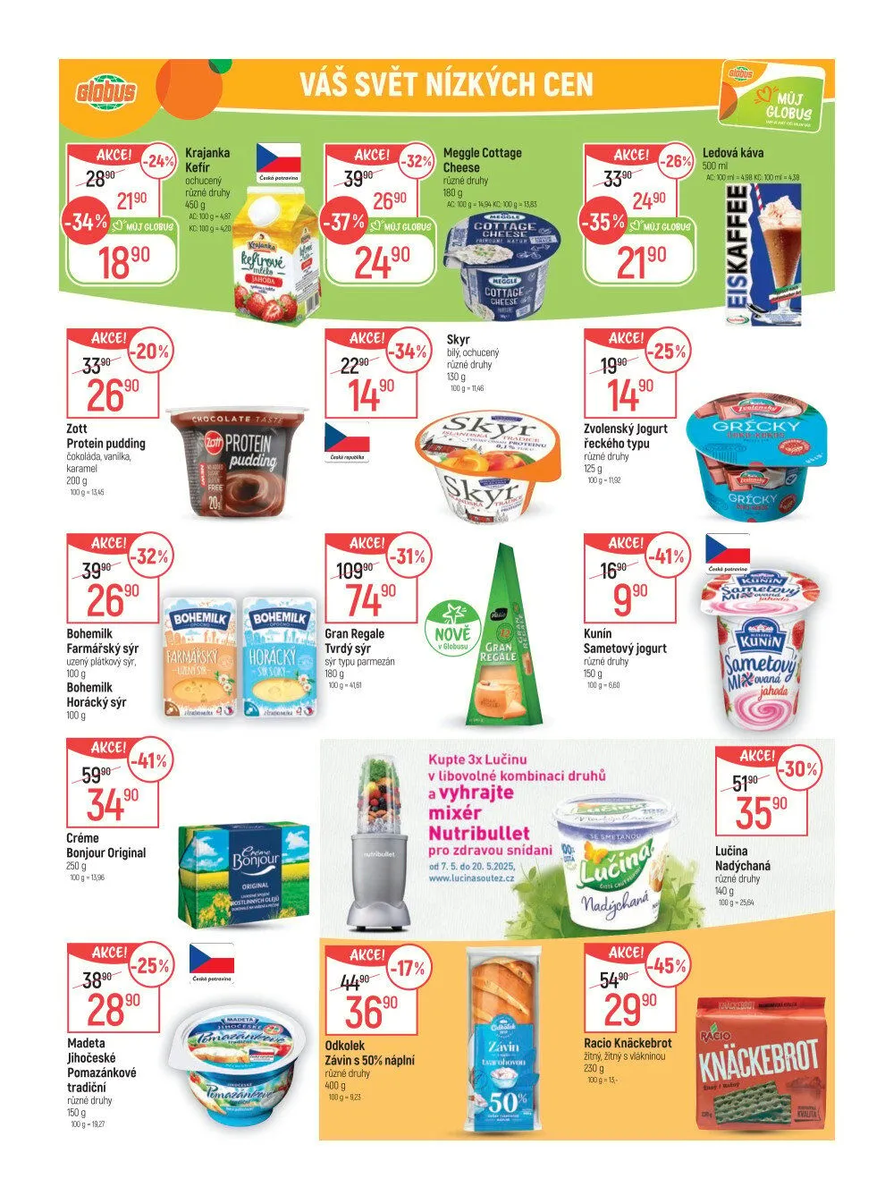 V letáku obchodu Globus najdete širokou nabídku kvalitních produktů za nízké ceny. Mezi nimi se objevují oblíbené položky jako krajanka, ochucený kefír a různé druhy cottage cheese od značky Meggle. Nezapomeňte na akční nabídku ledové kávy a proteinových pudinků od Zott v příchutích čokoláda, vanilka a karamel.