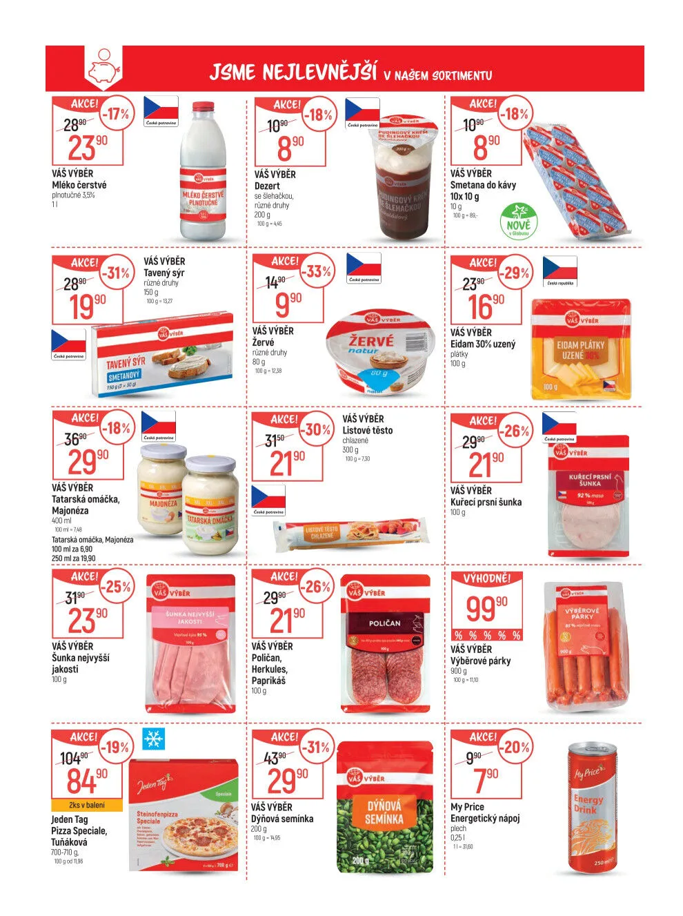 Mléko čerstvé plnotučné za 39 Kč, tatarská omáčka a majonéza 400 ml za 23,90 Kč, a šunka nejvyšší jakosti 100 g za 84,90 Kč.