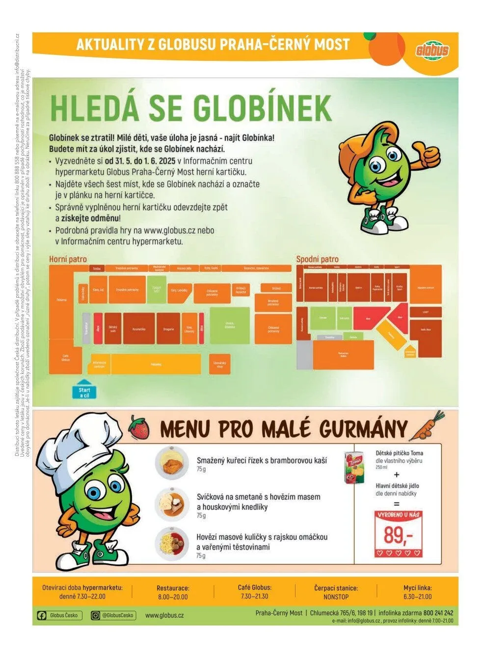 Hledá se globínek! Milé děti, zapojte se do zábavné hry a pomozte najít globínka! Od 31.5. do 1.6.2025 si v informačním centru hypermarketu Globus Praha-Černý Most vyzvedněte herní kartičku. Vaším úkolem je najít všech šest míst, kde se globínek skrývá, a označit je v plánku. Správně vyplněnou kartičku odevzdejte a získejte odměnu! Podrobnosti najdete na www.globus.cz nebo v informačním centru.