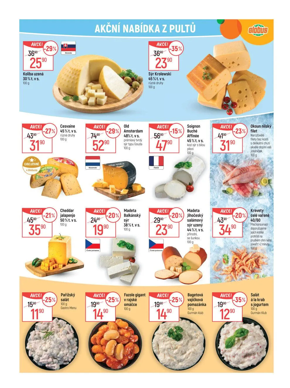 V letáku obchodu Globus najdete skvělé akční nabídky na široký sortiment produktů. Například uzená koliba je nyní za akční cenu 2590 Kč s 30% slevou. Sýr Krolewski a různé druhy sýra Cesvaine jsou také ve slevě, a to až 45%.