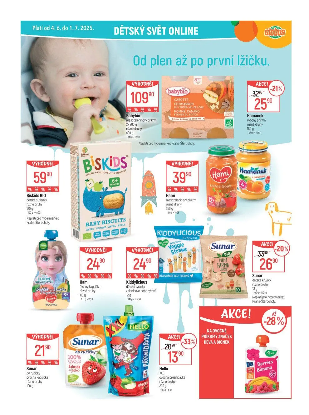 V letáku obchodu Globus najdete širokou nabídku produktů pro děti, které platí od 4.6. do 1.7.2025. Nabízíme různé druhy dětských příkrmů, od plen až po první lžičku. Mezi oblíbené značky patří abybio, hami a sunar.