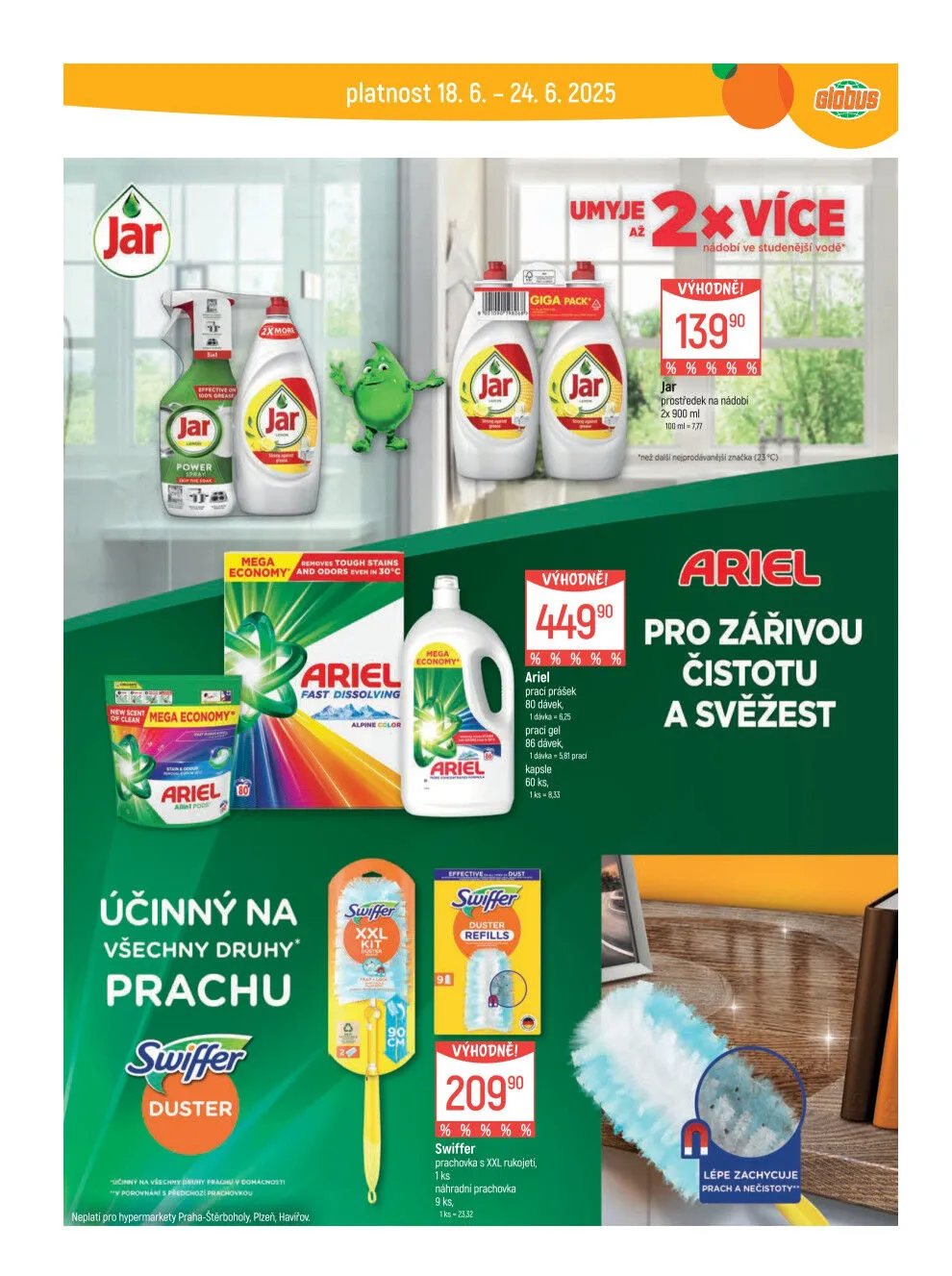 V letáku obchodu Globus najdete širokou nabídku produktů pro úklid a praní. Mezi nimi se objevují oblíbené značky jako Jar a Ariel. Nabízíme prací prášek Ariel s 80 dávkami, prací gel s 86 dávkami a kapsle Ariel v balení po 60 kusech. Všechny produkty jsou účinné na různé druhy prachu a zajišťují dokonalou čistotu. Dále si můžete pořídit úklidové pomůcky Swiffer, které efektivně zachycují prach a nečistoty. Nezapomeňte, že akce platí od 18. 6. do 24. 6. 2025. Využijte výhodné nabídky a užijte si čistotu a svěžest ve vašem domově!