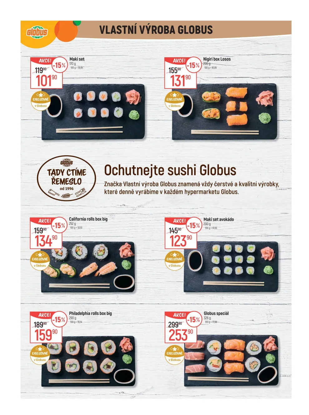 V letáku obchodu Globus najdete širokou nabídku sushi produktů z vlastní výroby. Ochutnejte naše čerstvé a kvalitní výrobky, které denně připravujeme v každém hypermarketu. Nabízíme například maki set, nigiri box s lososem, california rolls box a philadelphia rolls box. Všechny tyto produkty jsou nyní v akci, takže si je můžete pořídit za skvělé ceny. Nezapomeňte také vyzkoušet maki set s avokádem a další speciality. Těšíme se na vaši návštěvu!