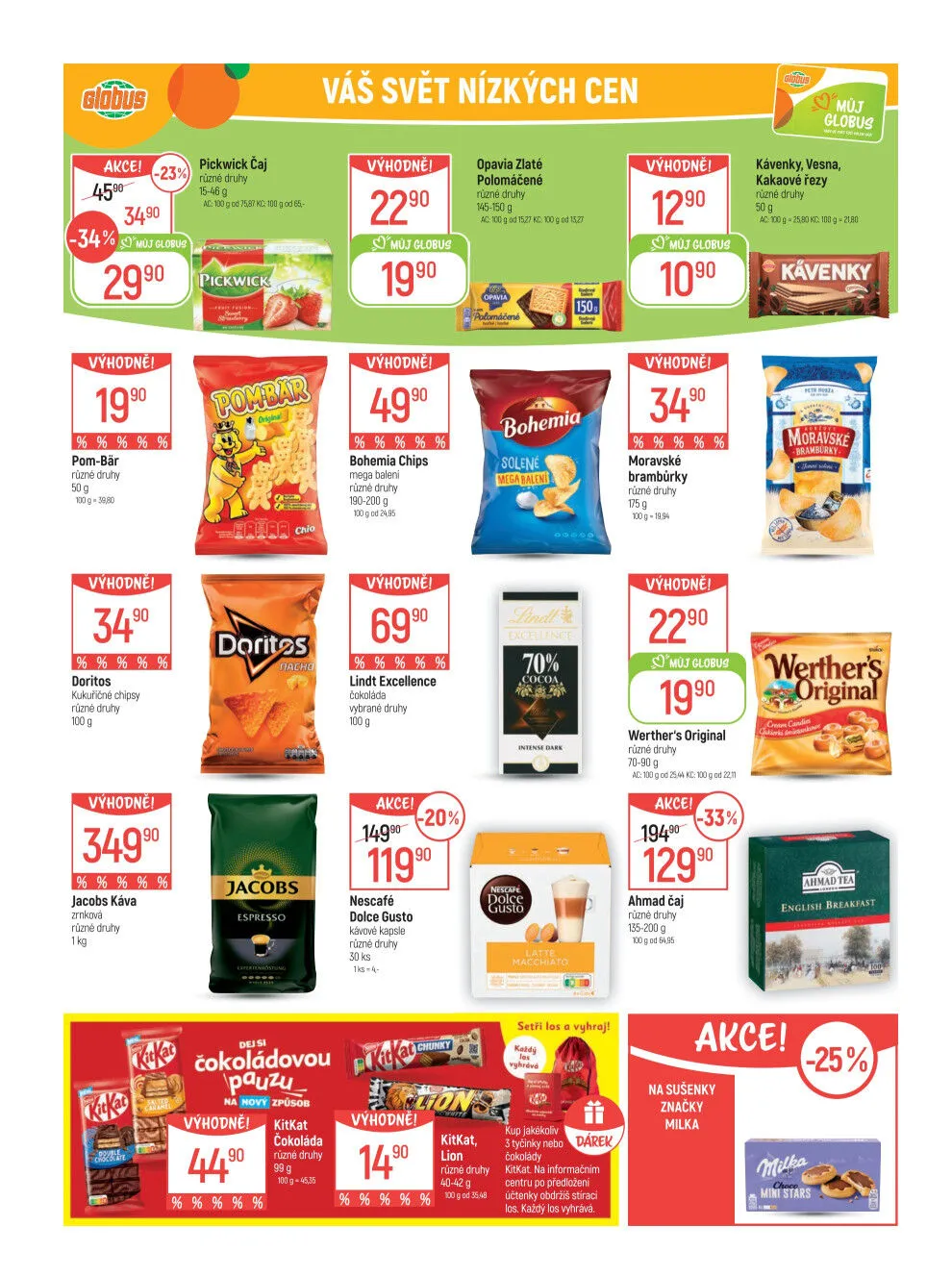 Zajímavé akce zahrnují kukuřičné chipsy Doritos, kávu Jacobs, čaj Pickwick a čokoládu Lindt Excellence.