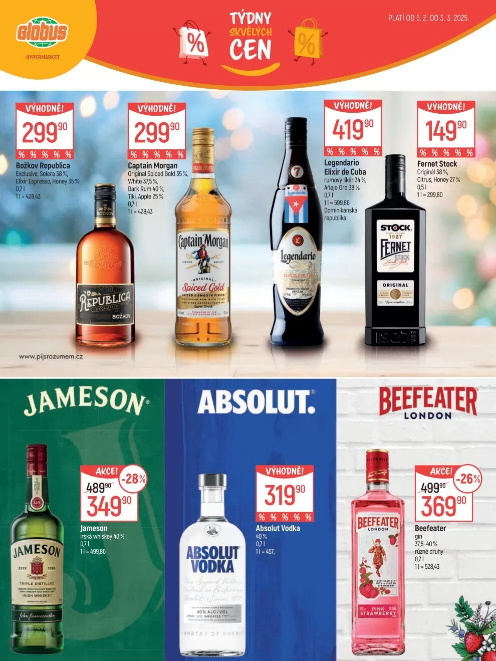 V letáku obchodu Globus najdete širokou nabídku výhodných produktů. Mezi nimi se objevují oblíbené alkoholické nápoje jako Božkov Republica, Captain Morgan Original Spiced Gold a Jameson irská whiskey.