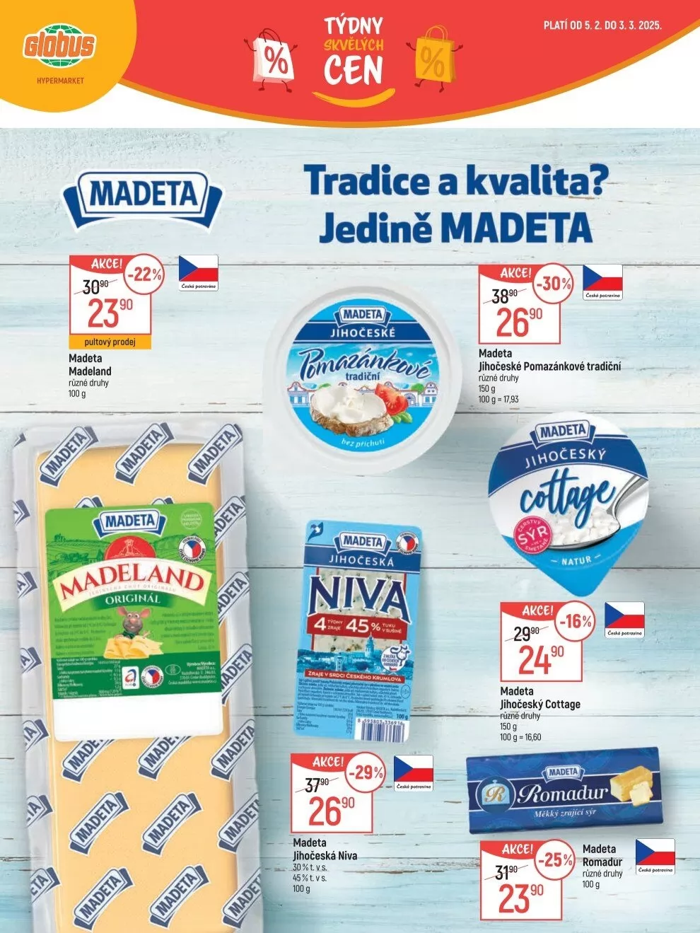 V letáku obchodu Globus najdete skvělé akce na produkty značky Madeta, které platí od 5.2. do 3.3.2025. Nabízíme různé druhy jihočeských sýrů, jako je Madeta jihočeská niva a pomazánkové sýry, které jsou nyní se slevou až -30%. Také si můžete vychutnat Madeta jihočeský cottage a měkký sýr romadúr, které jsou k dostání s výraznými slevami. Nezapomeňte, že tradice a kvalita jsou u Madety na prvním místě!