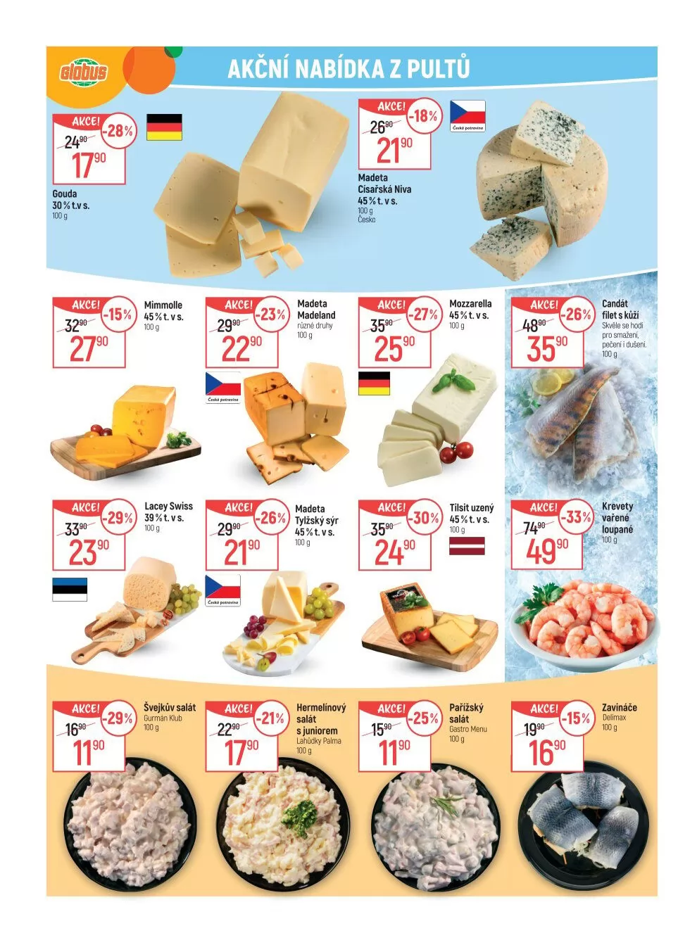 V letáku obchodu Globus najdete skvělé akční nabídky z pultů. Nabízíme například Goudu s 30% obsahem tuku za skvělou cenu 90 Kč za 100 g. Dále si můžete vychutnat Mimmolle s 45% tuku za 239 Kč za 100 g. Nezapomeňte také na Lacey Swiss s 39% tuku, který je k dostání za 90 Kč.