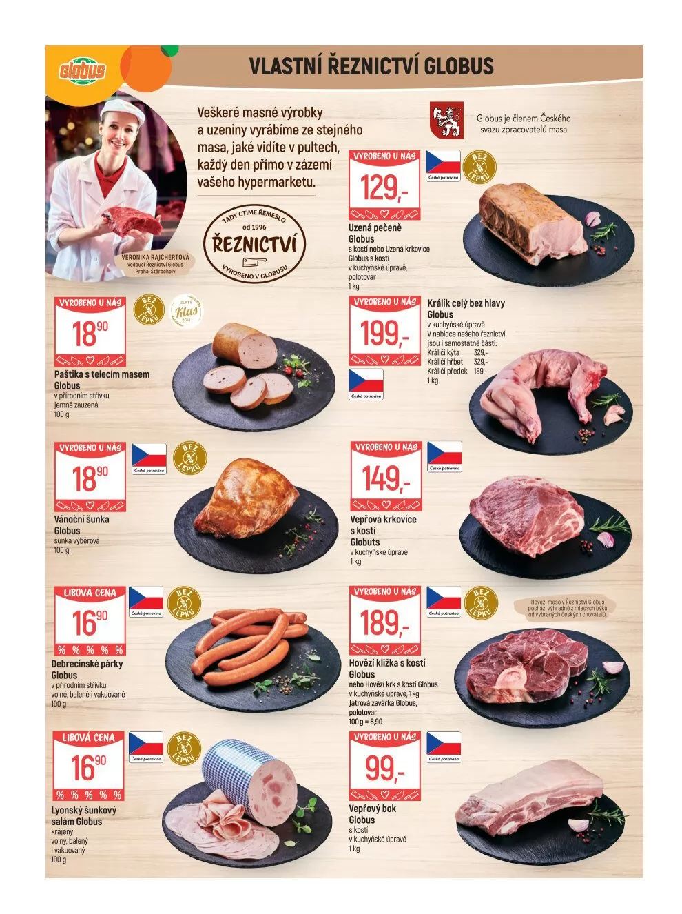V letáku obchodu Globus najdete širokou nabídku masných výrobků a uzenin, které jsou vyráběny přímo v jejich vlastním řeznictví. Všechny produkty jsou vyrobeny z kvalitního masa, které je k dispozici v pultech hypermarketu. Mezi nabízené produkty patří například jemná paštika s telecím masem, vánoční šunka, debrecínské párky a lyonský šunkový salám.