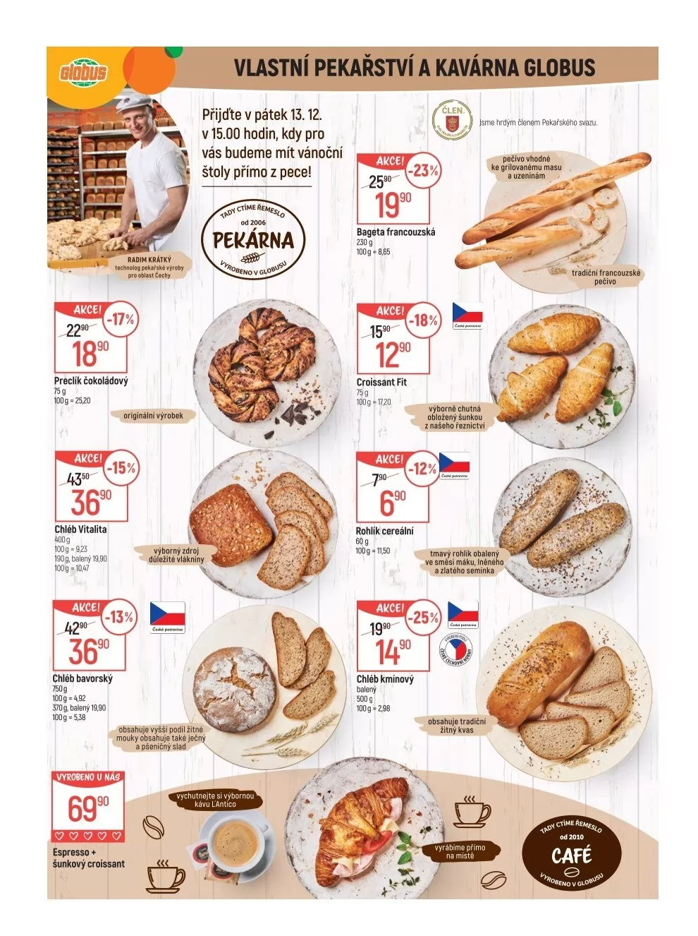 V letáku najdete akční nabídky, jako je francouzská bageta, croissant fit, čokoládový preclík a různé druhy chleba, včetně vitalitního a bavorského.
