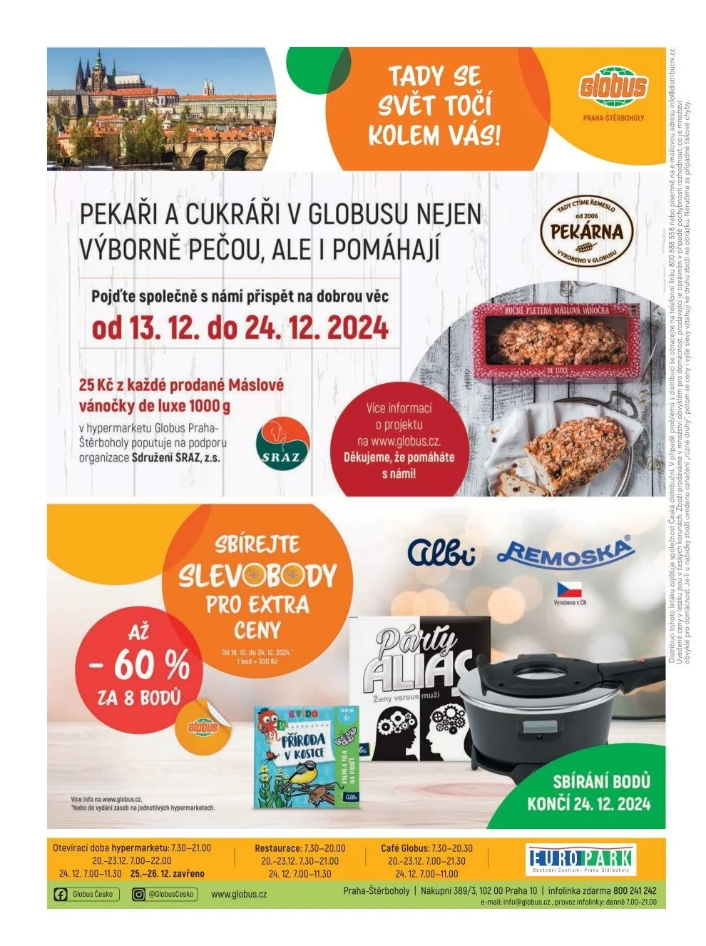 V obchodě Globus se můžete těšit na výborné produkty od našich pekařů a cukrářů. Od 13. do 24. prosince 2024 si můžete zakoupit máslovou vánočku de luxe (1000 g) a přispět tak na dobrou věc. Z každé prodané vánočky poputuje 25 Kč na podporu organizace sdružení Sraz, z.s.