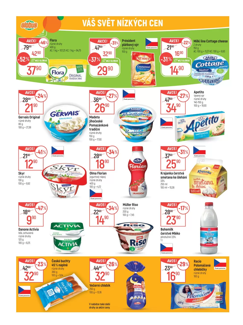 Mezi akčními položkami se objevují plátkový sýr Président a Gervais Original, oba v různých druzích po 100 g.