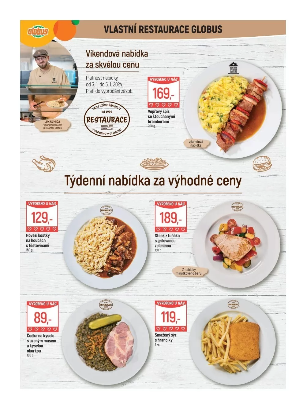 V letáku obchodu Globus najdete skvělou víkendovou nabídku, která platí od 3. do 5. ledna 2024, do vyprodání zásob. Mezi lákavými pokrmy se můžete těšit na vepřový špíz se šťouchanými bramborami za 169 Kč, hovězí kostky na houbách s těstovinami za 129 Kč a čočku na kyselo s uzeným masem a kyselou okurkou za 89 Kč. Dále si můžete vychutnat steak z tuňáka s grilovanou zeleninou za 189 Kč a smažený sýr s hranolky. Nezapomeňte, že nabídka je platná pouze o víkendu a ceny jsou výhodné!
