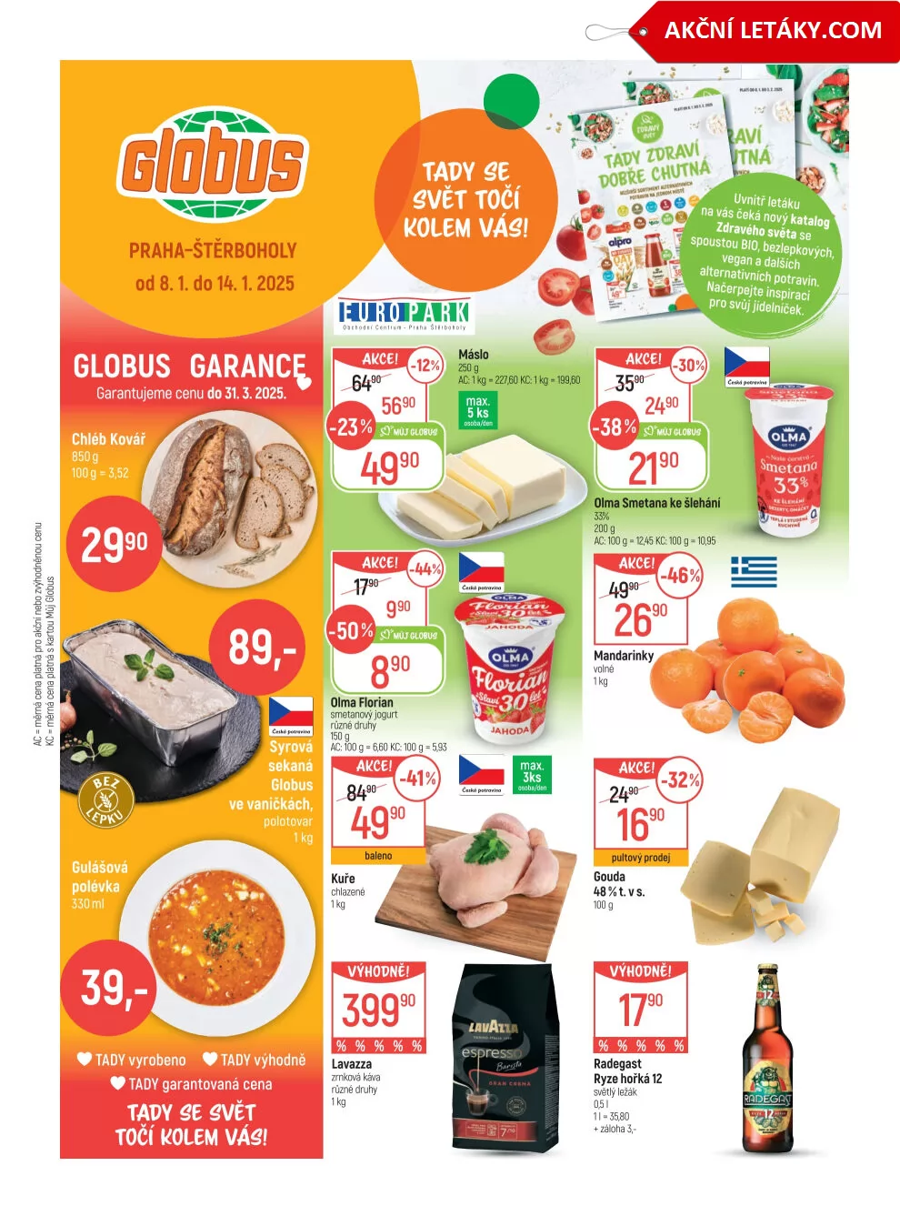 V letáku obchodu Globus najdete širokou nabídku kvalitních produktů, které potěší každého zákazníka. Mezi hlavními položkami se objevuje chléb Kovář (850 g) za 29,90 Kč a polotovar sekaná Globus (1 kg) za 90 Kč. Nezapomeňte také na máslo za 56,90 Kč a akční nabídku na mandarinky (1 kg) za 24,90 Kč.