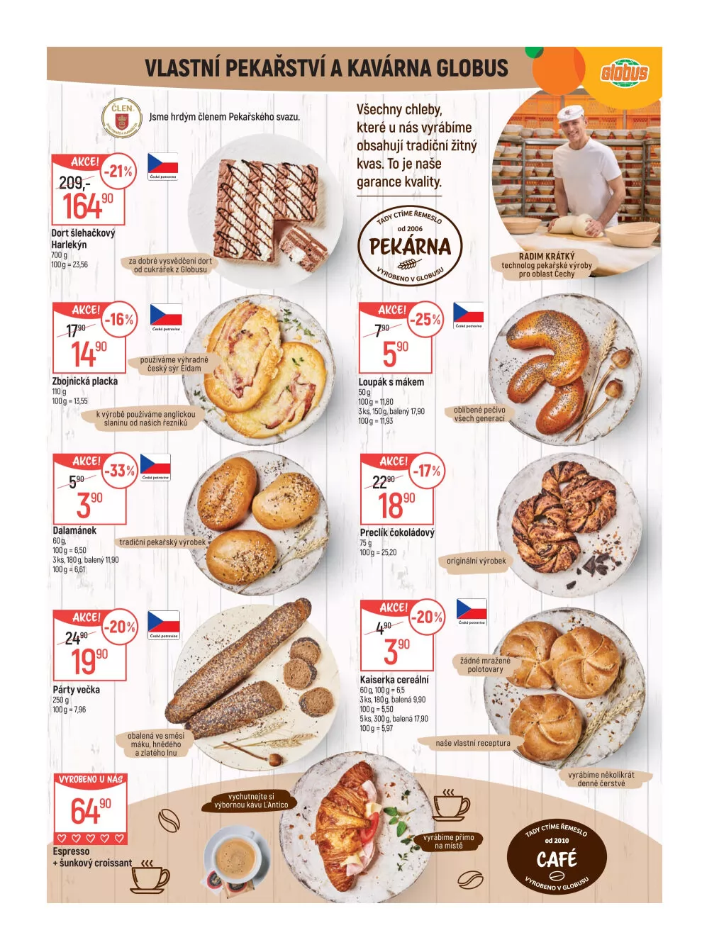 V letáku obchodu Globus najdete širokou nabídku čerstvého pečiva a lahodných dortů.