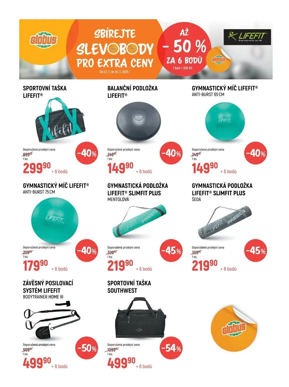 Gymnastické podložky Lifefit Slimfit Plus, anti-burst, jsou v nabídce ve dvou velikostech: 65 cm za 14990 Kč a 75 cm za doporučenou cenu 7990 Kč, obě za 6 bodů.