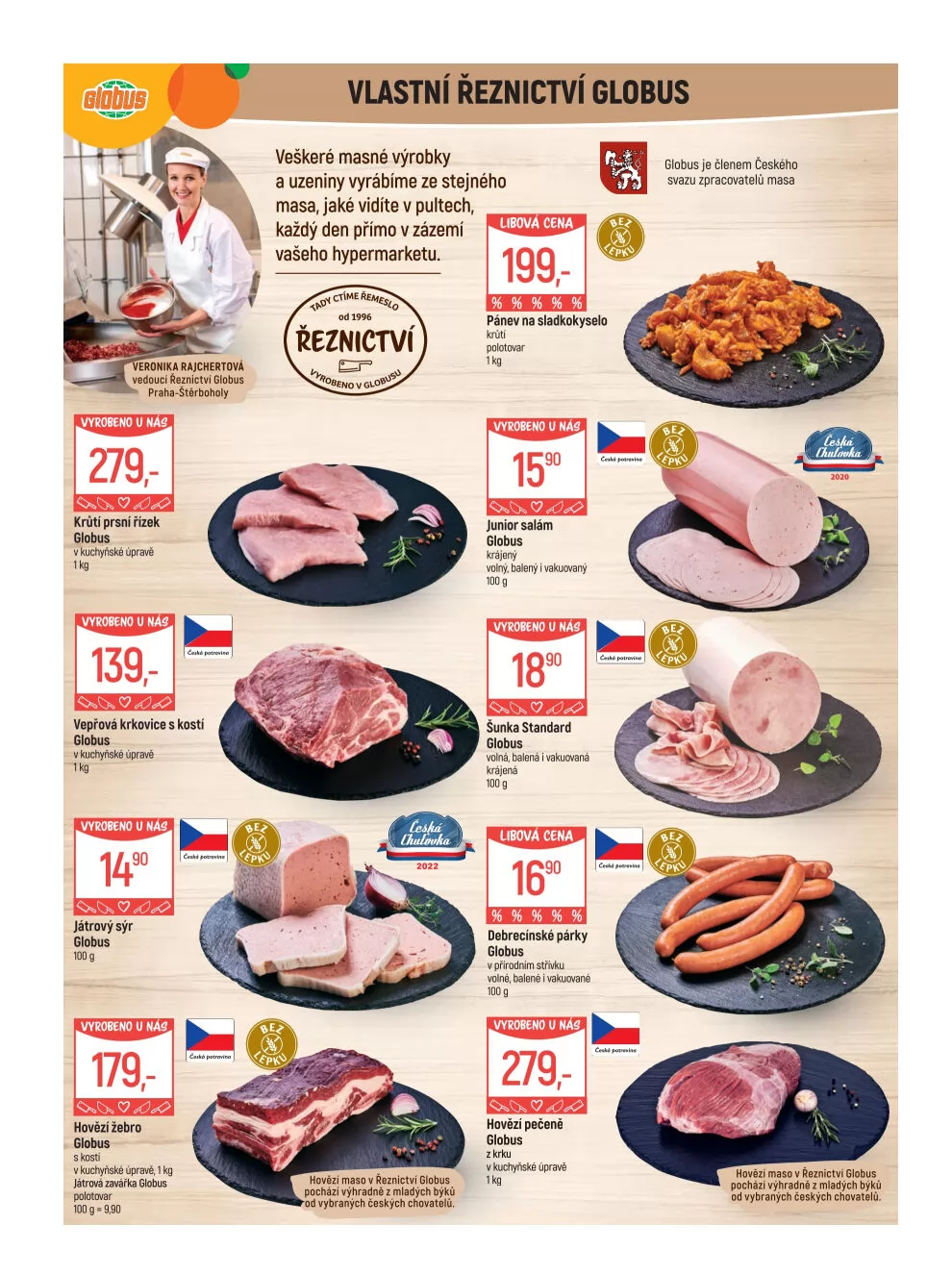 V letáku obchodu Globus najdete širokou nabídku masných výrobků a uzenin, které jsou vyráběny z kvalitního masa. Naše řeznictví se pyšní tím, že veškeré produkty pocházejí z mladých býků od vybraných českých chovatelů.