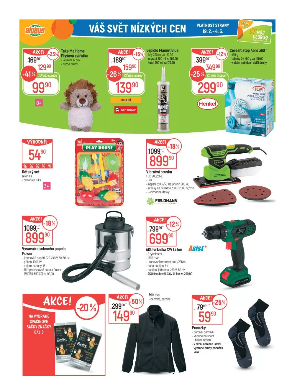 V letáku obchodu Globus najdete širokou nabídku produktů za nízké ceny, platnou od 19.2. do 4.3. Mezi akčními položkami se objevují plyšová zvířátka, lepidlo Mamut Glue, a pohlcovač vlhkosti značky Henkel. Dále si můžete pořídit vysavač studeného popela s příkonem 1000 W nebo vibrační brusku. Pro kutily je k dispozici aku vrtačka 12V a také různé druhy svačinových sáčků značky Balis. Nezapomeňte také na dámské a pánské mikiny a sportovní ponožky, které jsou v akční nabídce. Navštivte Globus a využijte skvělé slevy!