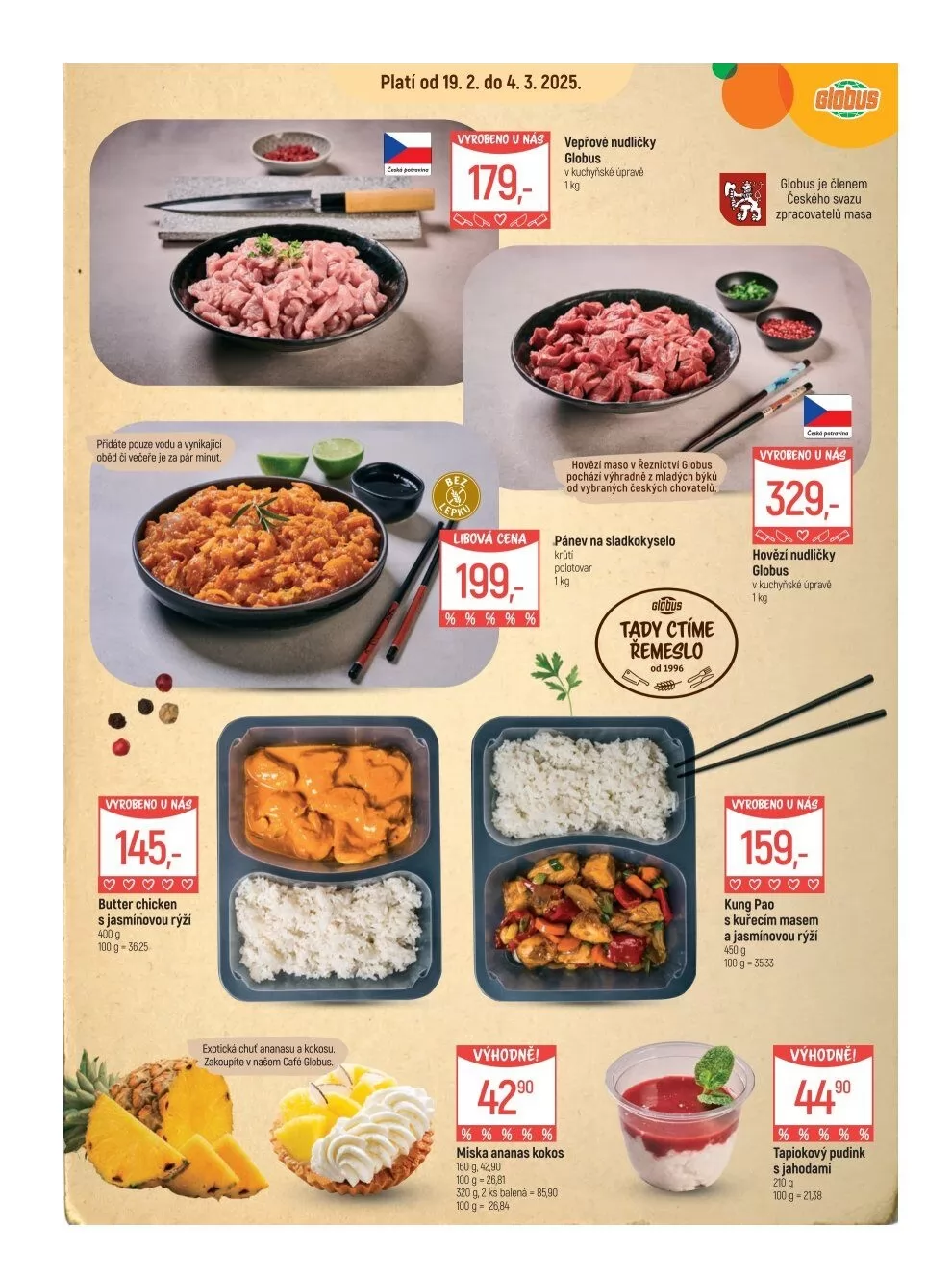 V letáku obchodu Globus najdete širokou nabídku chutných produktů, které potěší vaše chuťové pohárky. Od 19.2. do 4.3.2025 si můžete zakoupit vepřové nudličky, které stačí jen podlít vodou a máte vynikající oběd za pár minut. Dále nabízíme exotické Butter Chicken s jasmínovou rýží za 199,- Kč, které vás přenese do dalekých krajů.