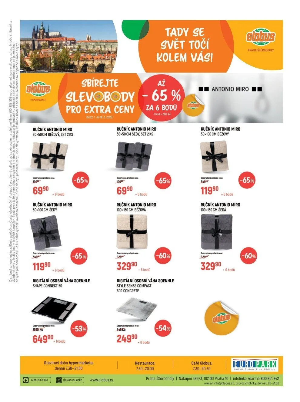 V letáku obchodu Globus najdete skvělé nabídky na produkty značky Antonio Miro. Nabízíme ručníky v různých velikostech, například set dvou béžových ručníků o rozměrech 30x50 cm za 69,90 Kč, nebo šedý ručník o velikosti 50x100 cm za 119,90 Kč. Všechny ručníky jsou nyní se slevou až 65 % a za každý nákup získáte body.