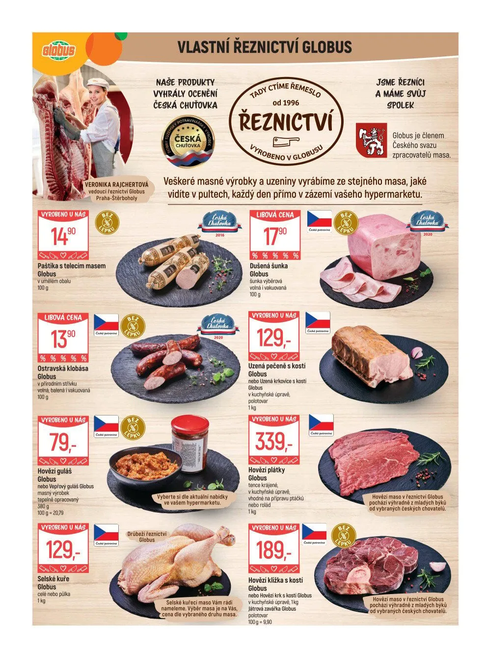 V našem řeznictví Globus ctíme tradiční řemeslo a od roku 1996 vyrábíme kvalitní masné výrobky, které získaly ocenění za svou chuť. Naše produkty, jako je paštika s telecím masem, ostravská klobása, hovězí a vepřový guláš, a selské kuře, jsou vyráběny přímo v zázemí hypermarketu z masa, které vidíte na pultech.