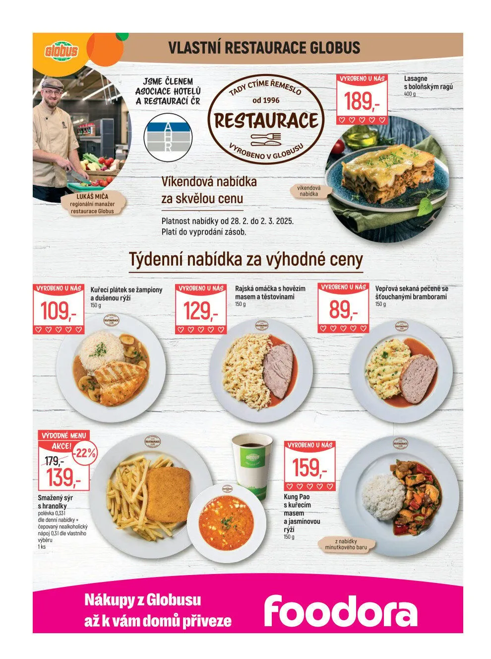 V letáku obchodu Globus najdete skvělou víkendovou nabídku s výhodnými cenami. Od 28. února do 2. března 2025 si můžete vychutnat lahodné lasagne s boloňským masem za 189 Kč. Dále nabízíme rajskou omáčku s hovězím a kuřecí plátek se žampiony, každý za 109 Kč. Nezapomeňte také na naše výhodné menu, které zahrnuje smažený sýr s hranolky a čepovaný nealkoholický nápoj dle vlastního výběru. V nabídce je také vepřová sekaná pečená se šťouchanými bramborami za 129 Kč a kung pao s kuřecím a jasmínovou rýží za 159 Kč. Všechny produkty jsou vyrobeny s láskou a péčí. Nákupy z Globusu vám přiveze až domů služba Foodora.