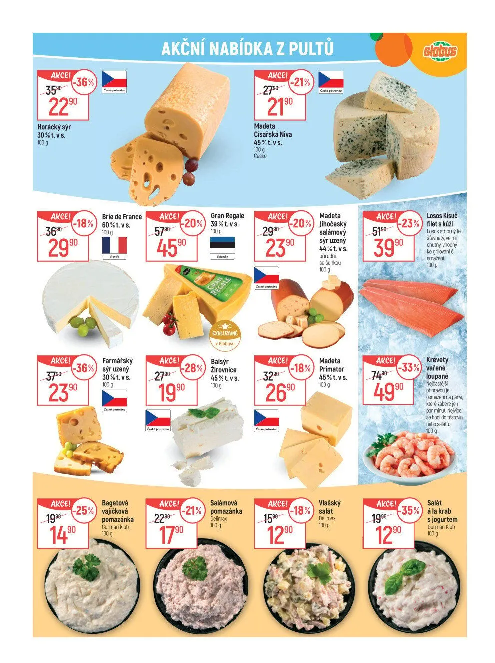 V letáku obchodu Globus najdete skvělé akční nabídky z pultů. Mezi nimi se objevuje Horácký sýr s 30% tuku, který je nyní za akční cenu 90 Kč. Dále můžete vyzkoušet Varené Brie de France, které je také v akci. Pro milovníky uzených sýrů je tu Farmářský sýr uzený s 30% tuku.