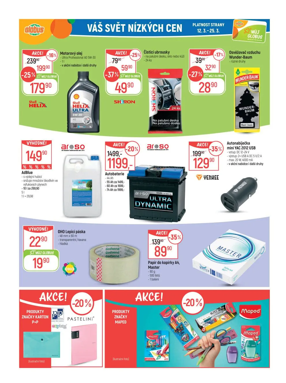 V letáku obchodu Globus najdete širokou nabídku produktů za nízké ceny, platnou od 12.3. do 25.3. Mezi akčními položkami se objevují motorové oleje, jako je Shell Helix, nyní za 199,90 Kč, a AdBlue s výhodnou hubicí za 179,90 Kč.