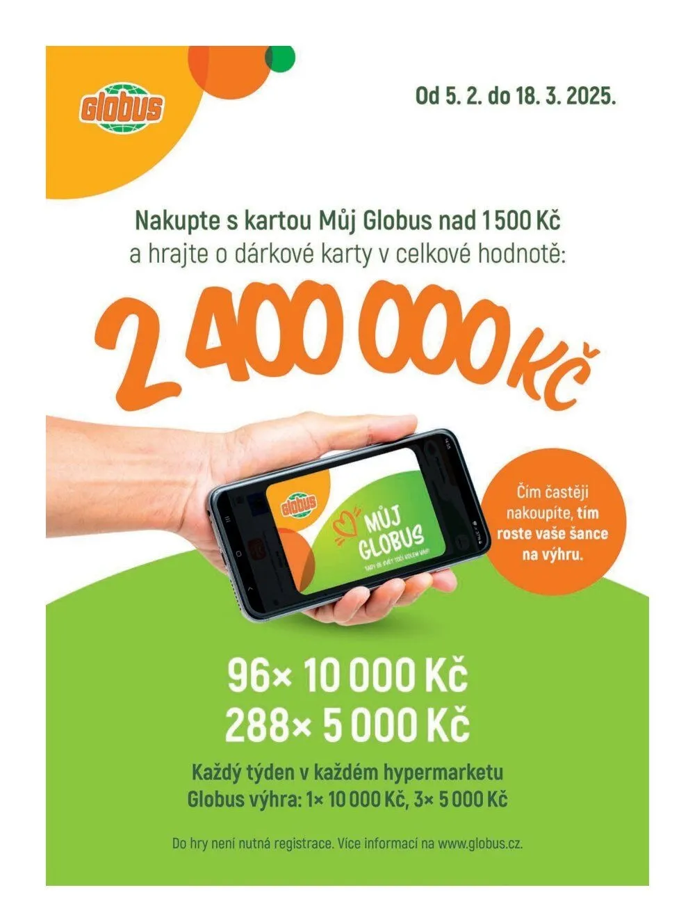 Nakupte v obchodu Globus od 5.2. do 18.3.2025 a získejte šanci vyhrát dárkové karty! Při nákupu nad 1 500 Kč s kartou Můj Globus se zapojíte do soutěže. Čím častěji nakupujete, tím větší máte šanci na výhru. Každý týden v každém hypermarketu Globus můžete vyhrát 10x 10 Kč a 3x 5 000 Kč. Registrace do hry není nutná. Více informací naleznete na www.globus.cz.