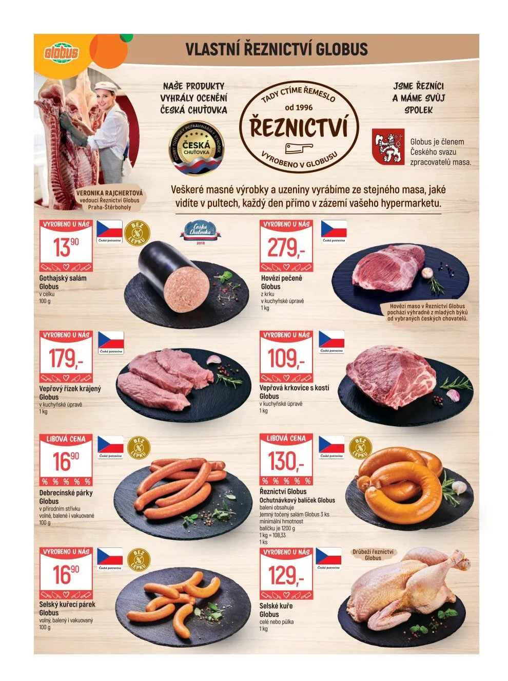 V řeznictví Globus najdete širokou nabídku kvalitních masných výrobků, které získaly ocenění za svou chuť. Naše produkty, jako je gothajský salám, vepřový řízek krájený, debrecínské párky a selské kuře, jsou vyráběny přímo v zázemí hypermarketu z masa od vybraných českých chovatelů.