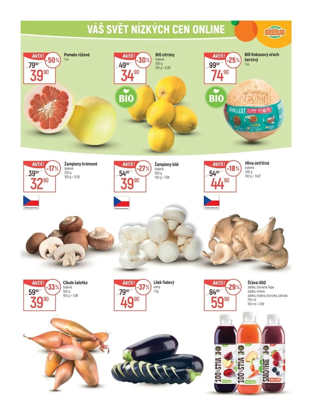 Zaujmou vás například růžové pomelo za 32,90 Kč a krémové žampiony, které jsou nyní v akci.