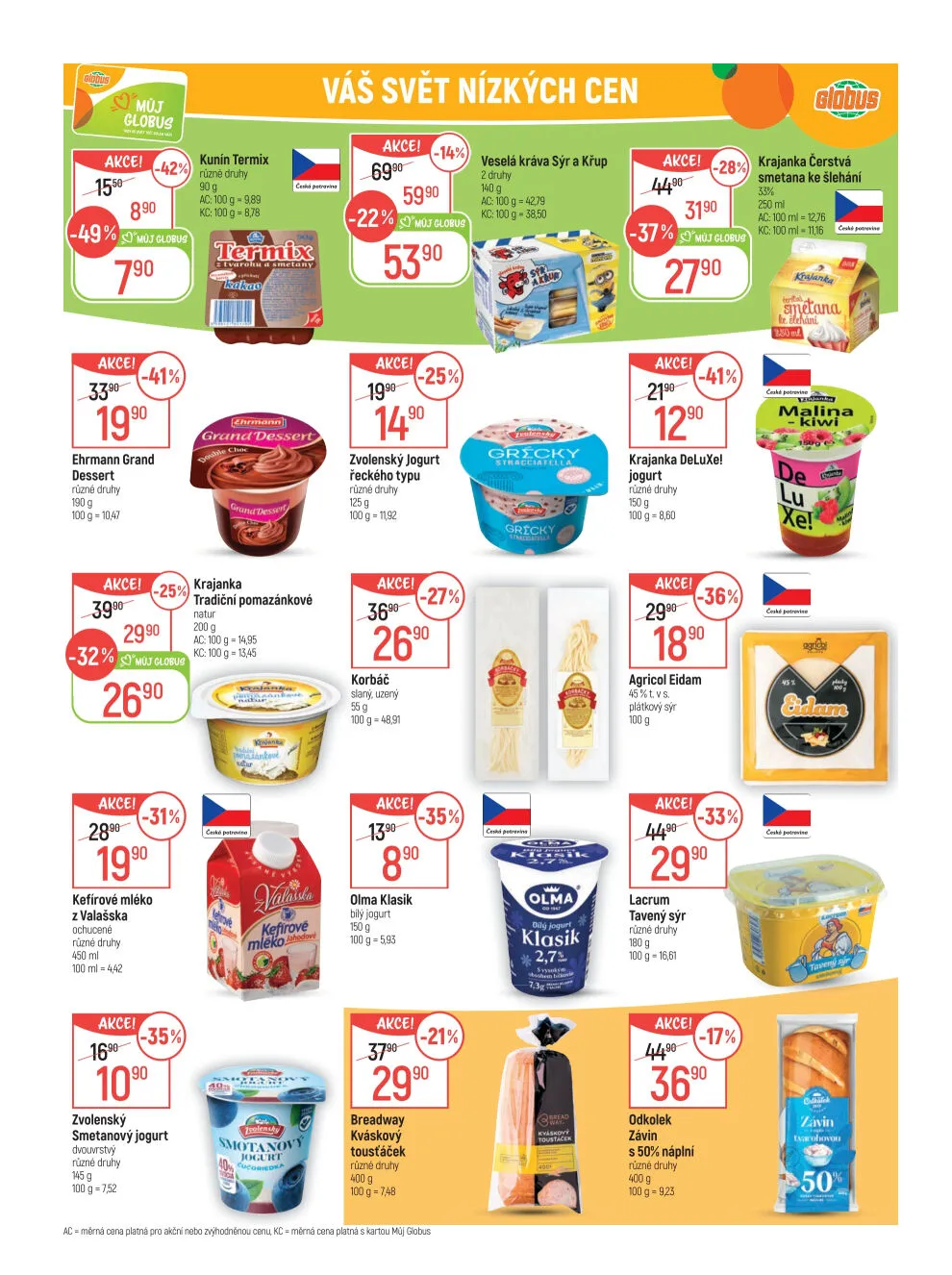 V letáku obchodu Globus najdete širokou nabídku produktů za výhodné ceny. Mezi akčními položkami se objevují různé druhy jogurtů, jako je Zvolenský smetanový jogurt a jogurt řeckého typu. Dále si můžete vybrat z lahodných pomazánkových sýrů Krajanka a Olma klasik.