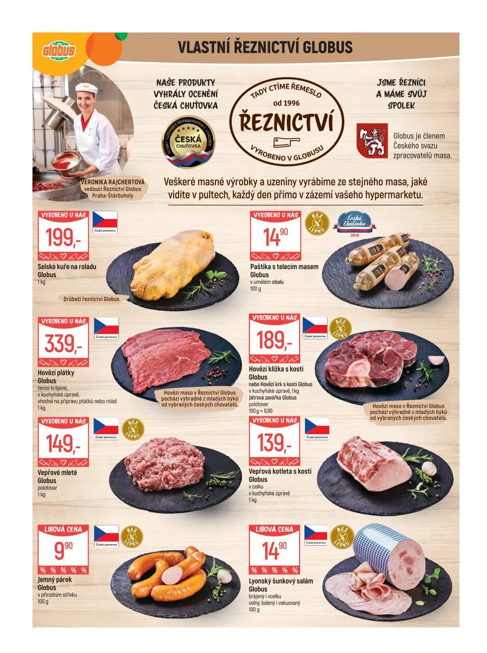 V letáku obchodu Globus najdete širokou nabídku kvalitních masných výrobků z vlastního řeznictví. Naše produkty, jako jsou selské kuře na roládu za 199 Kč, hovězí plátky za 339 Kč a jemný párek za 90 Kč, získaly ocenění za svou chuť a kvalitu. Všechny masné výrobky a uzeniny vyrábíme ze stejného masa, které vidíte v našich pultech, přímo v zázemí hypermarketu.