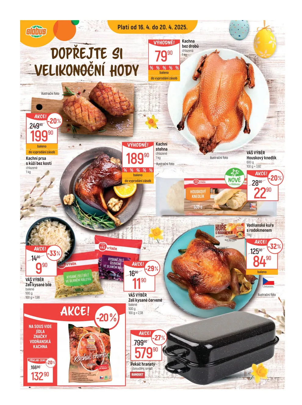 V letáku obchodu Globus, platném od 16.4. do 20.4.2025, najdete skvělé akce na široký výběr produktů. Dopřejte si kachní prsa chlazená s kůží bez kosti za cenu 199,90 Kč. Dále nabízíme kachní stehýnka a vodňanské kuře s rodokmenem, které jsou nyní ve výhodné akci. Nezapomeňte také na kysané zelí červené a houskový knedlík, které jsou ideální přílohou k vašim velikonočním hodům. Všechny produkty jsou k dispozici do vyprodání zásob. Navštivte nás a využijte těchto skvělých nabídek!