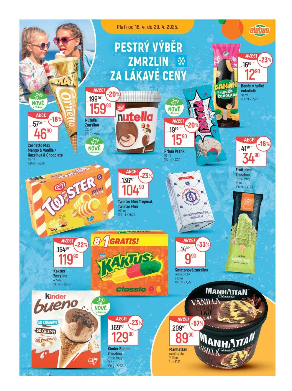 Navštivte obchod Globus a objevte pestrý výběr zmrzlin za lákavé ceny! Akce platí od 16.4. do 29.4.2025. Využijte slevu -20% na vybrané produkty. Mezi novinkami najdete Cornetto Max s Nutellou, Twister Mini Tropical a další lahodné zmrzliny. Nezapomeňte také na smetanovou zmrzlinu a různé druhy ovocných zmrzlin, jako je mango vanilla nebo hazelnut & chocolate. Přijďte si vychutnat sladké osvěžení a využijte skvělé akce!