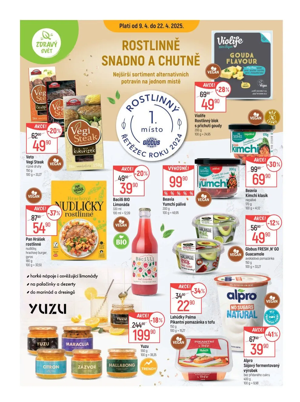 V letáku obchodu Globus najdete širokou nabídku zdravých a chutných rostlinných produktů. Od 9.4. do 22.4.2025 si můžete vychutnat různé druhy veganských steaků, jako je například vegi steak s příchutí goudy. Na své si přijdou i milovníci horkých nápojů a osvěžujících limonád, které jsou ideální na palačinky a dezerty.