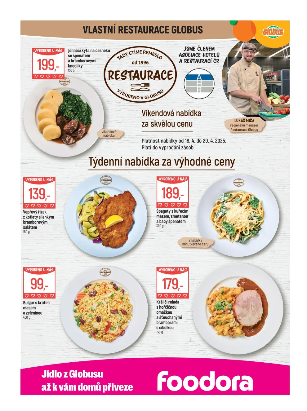 V letáku obchodu Globus najdete skvělou nabídku jídel z vlastní restaurace. Mezi lákavé pokrmy patří vepřový řízek z kotlety s lehkým bramborovým salátem za 199 Kč a bulgur s krůtím masem a zeleninou za 99 Kč. Nezapomeňte také na jehněčí kýtu na česneku se špenátem a bramborovými knedlíky.
