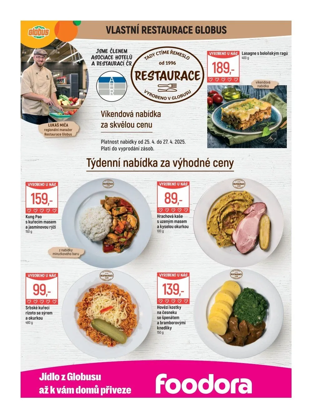 Nezapomeňte také na hrachovou kaši s uzeným masem a kyselou okurkou za 89 Kč, nebo hovězí kostky na česneku se špenátem a bramborovými knedlíky. Všechny pokrmy jsou vyrobeny přímo v restauracích Globus. Nabídka platí od 25.4. do 27.4.2025 a je dostupná do vyprodání zásob. Objednat si můžete také přes Foodora a nechat si jídlo přivézt až domů.