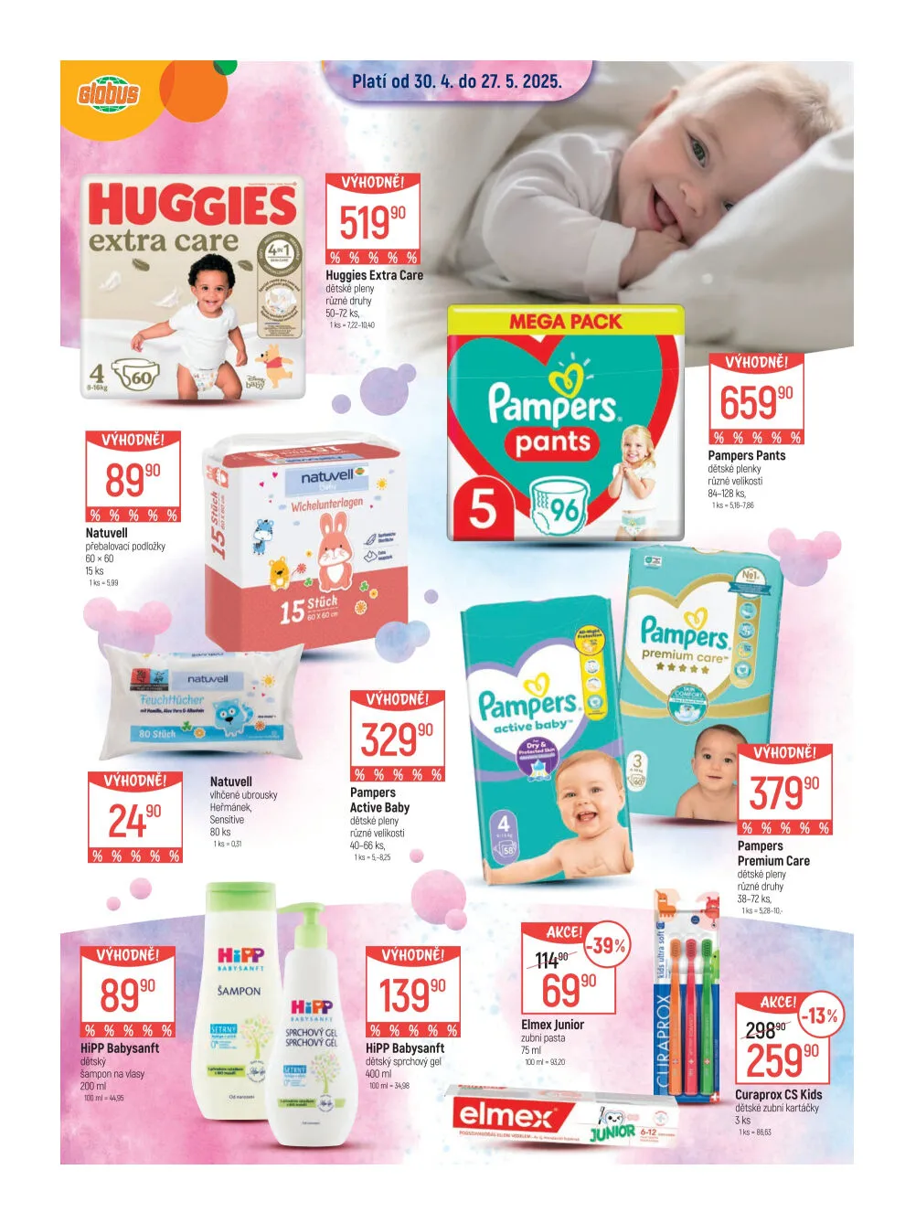 V letáku obchodu Globus najdete širokou nabídku výhodných produktů pro děti, které platí od 30.4. do 27.5.2025. Mezi nimi jsou například Huggies Extra Care dětské pleny v mega packu, které jsou k dispozici v různých druzích. Dále nabízíme Natuvell přebalovací podložky a vlhčené ubrousky s heřmánkem.