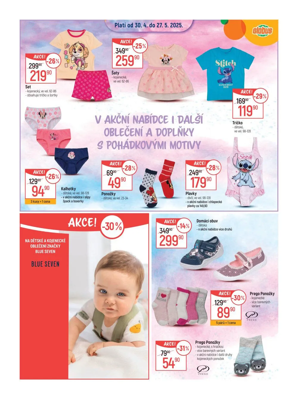 V letáku obchodu Globus najdete širokou nabídku produktů pro děti a kojence. Aktuálně probíhá akce na kojenecké oblečení, včetně triček, šortek a šatů, s cenami začínajícími na 21,990 Kč. Dále jsou v nabídce dětské ponožky ve velikostech 23-54 a kalhotky v akci za 49,90 Kč.