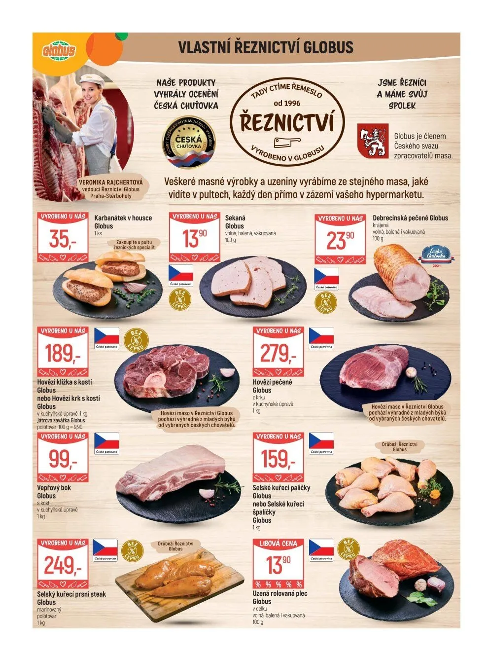 V našem řeznictví Globus ctíme tradiční řemeslo a nabízíme široký výběr kvalitních masných výrobků. Od roku 1996 jsme hrdí na to, že naše produkty získaly ocenění za vynikající chuť. Všechny naše masné výrobky a uzeniny vyrábíme přímo v zázemí hypermarketu, což zaručuje čerstvost a kvalitu.