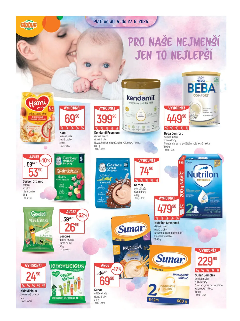 V letáku obchodu Globus najdete širokou nabídku produktů pro vaše nejmenší. Od 30. dubna do 27. května 2025 si můžete pořídit výhodné akce na dětské křupky Gerber Organic, které jsou k dostání v různých druzích za skvělou cenu 24,90 Kč.