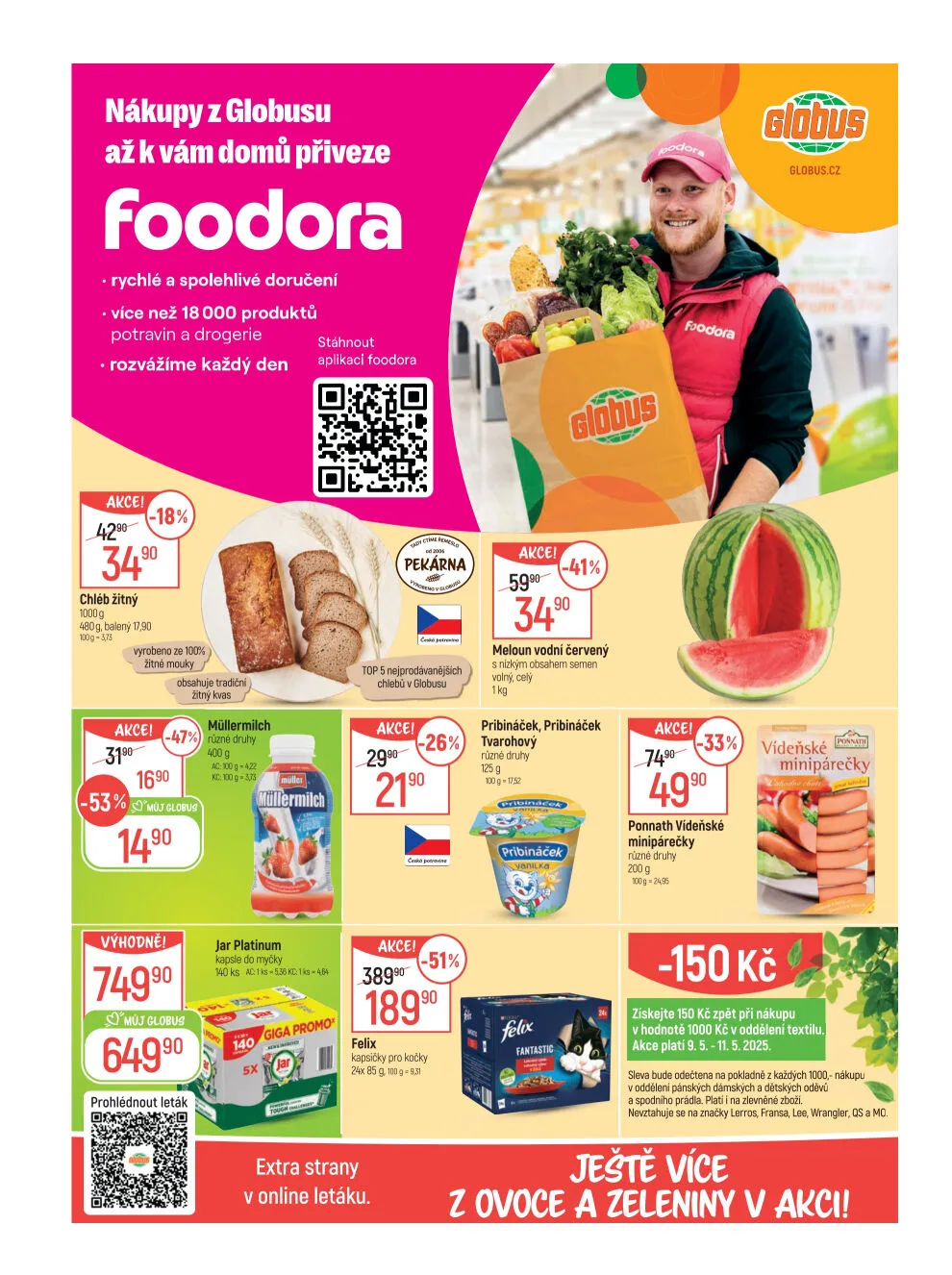 Mezi akčními produkty se nachází žitný chléb za 34,90 Kč, meloun vodní červený za 13,90 Kč a tvarohový pribináček. Nezapomeňte také na Müller Milch a kapsle Jar Platinum do myčky.