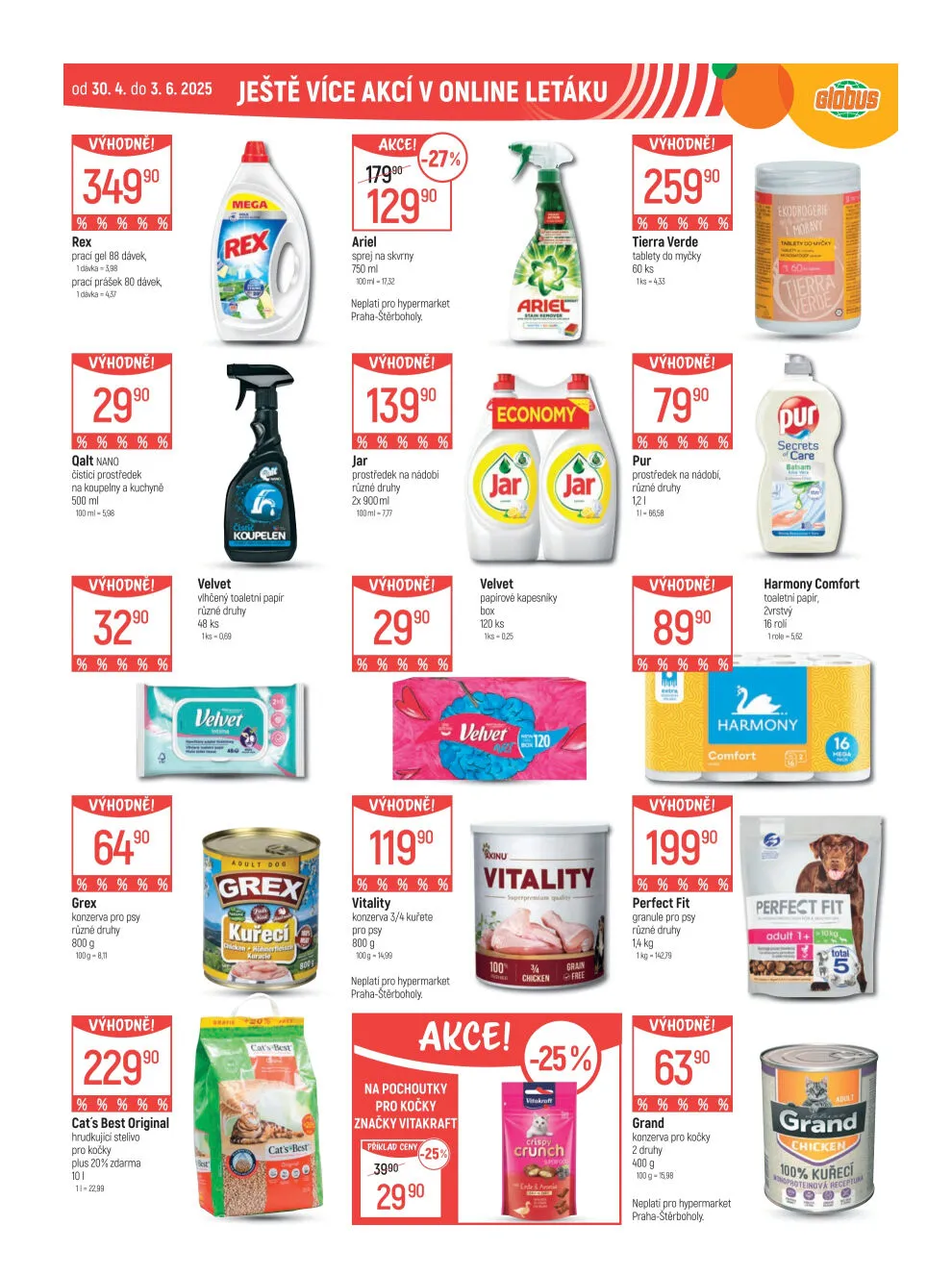 V letáku obchodu Globus najdete širokou nabídku výhodných produktů od 30.4. do 3.6.2025. Mezi nimi je například prací gel za 349,90 Kč a prací prášek za 299,90 Kč. Pro úklid domácnosti doporučujeme čisticí prostředek na koupelny a kuchyně o objemu 500 ml za 32,90 Kč.