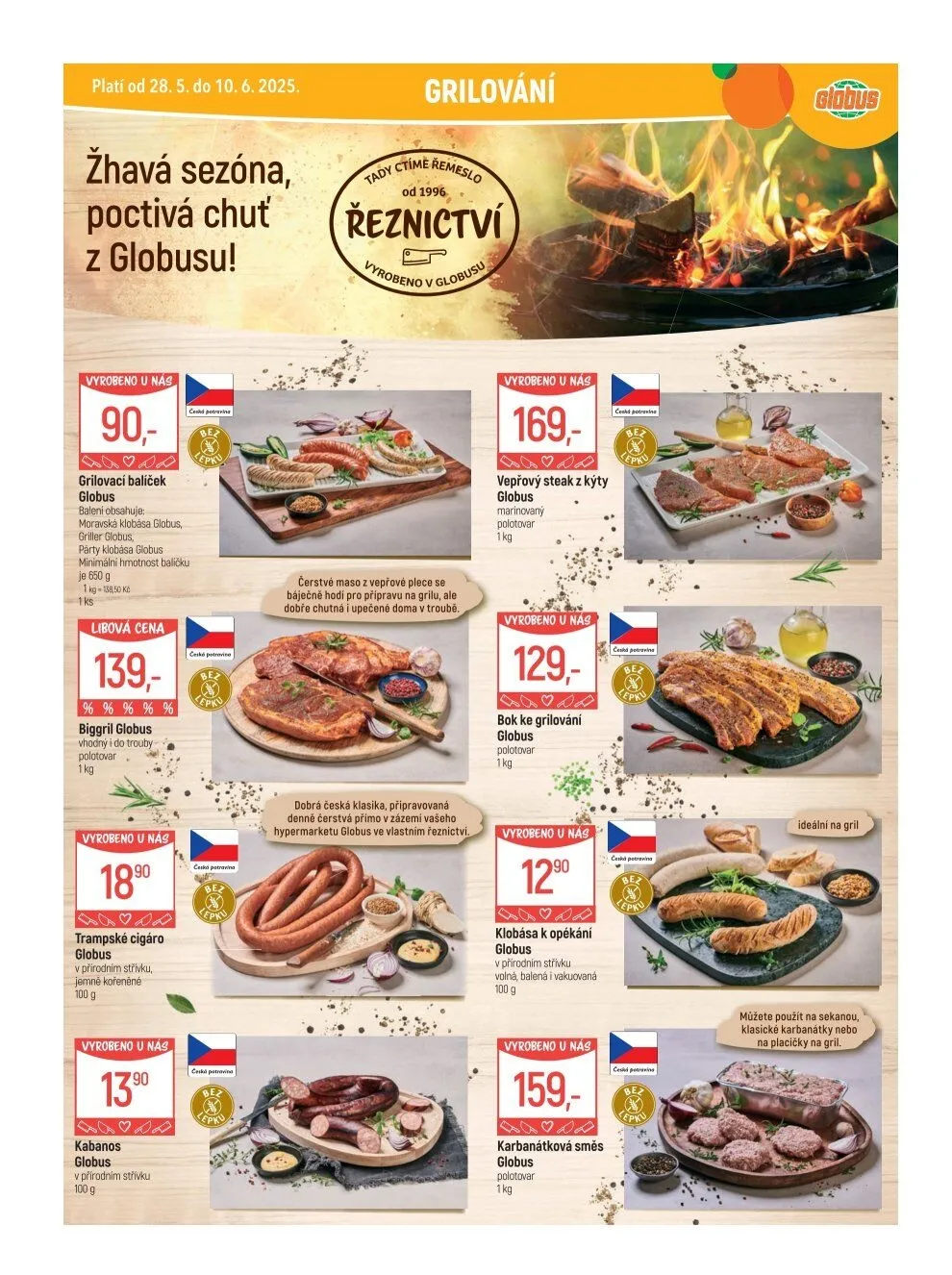 Mezi dalšími produkty se objevují trampská cigára a kabanosy, které jsou připravené v přírodním střevě. Nezapomeňte také na bok ke grilování a karbanátkovou směs, kterou můžete využít na klasické karbanátky nebo na lahodné placičky. Všechny produkty jsou vyráběny čerstvě přímo v řeznictví vašeho hypermarketu Globus. Přijďte si pro skvělé chutě a užijte si žhavou sezónu grilování!