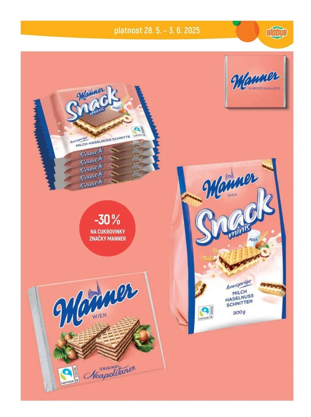 V letáku obchodu Globus najdete skvělé nabídky platné od 28. 5. do 3. 6. 2025. Mezi nimi se objevují lahodné cukrovinky značky Manner. Doporučujeme vyzkoušet Manner Milch Haselnuss Schnitten v balení 300 g. Nezapomeňte si je přidat do svého nákupního seznamu!