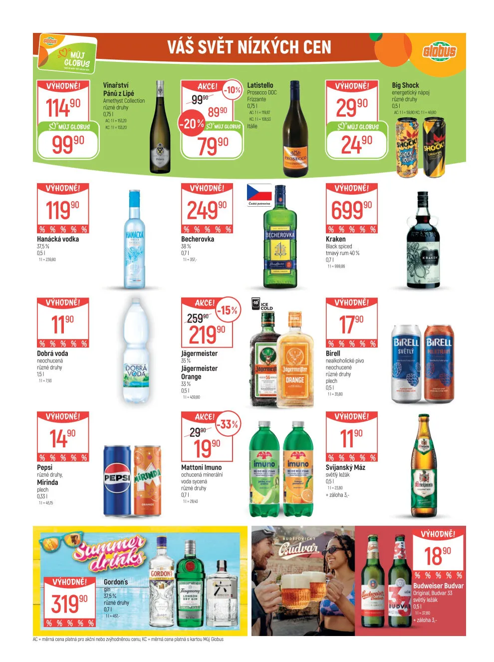 V letáku obchodu Globus najdete širokou nabídku výhodných produktů za nízké ceny. Mezi nimi se objevují oblíbené nápoje jako Hanácká vodka, Becherovka a Jägermeister, které jsou nyní v akci. Nezapomeňte také na osvěžující minerální vodu Mattoni a energetické nápoje Big Shock. Pro milovníky piva máme v nabídce Svijanský máz a Budweiser Budvar. Všechny produkty jsou pečlivě vybrány a nabízeny za skvělé ceny, takže si určitě vyberete!