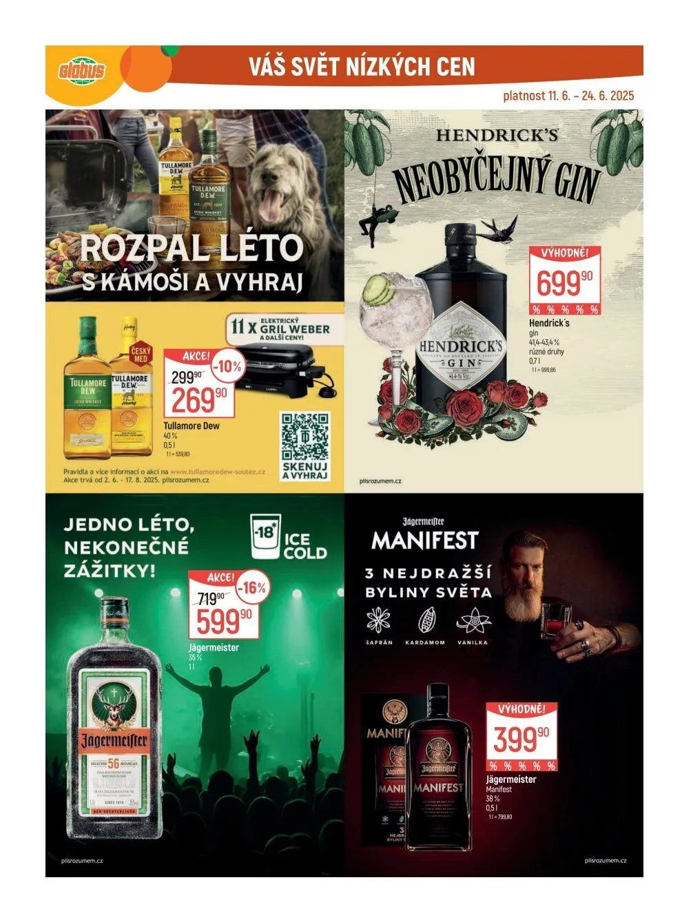 V letáku obchodu Globus najdete širokou nabídku produktů za nízké ceny, platnou od 11.6. do 24.6.2025. Mezi lákavé položky patří různé druhy ginů Hendrick's, které jsou k dispozici za cenu 699,90 Kč. Dále si můžete pořídit whiskey Tullamore Dew za 269,90 Kč. Nezapomeňte také na akci s grilem Weber, která přináší skvělé zážitky. A pro milovníky bylin je tu Jágermeister, který můžete zakoupit za 599,90 Kč. Využijte skvělé nabídky a užijte si léto plné zážitků!