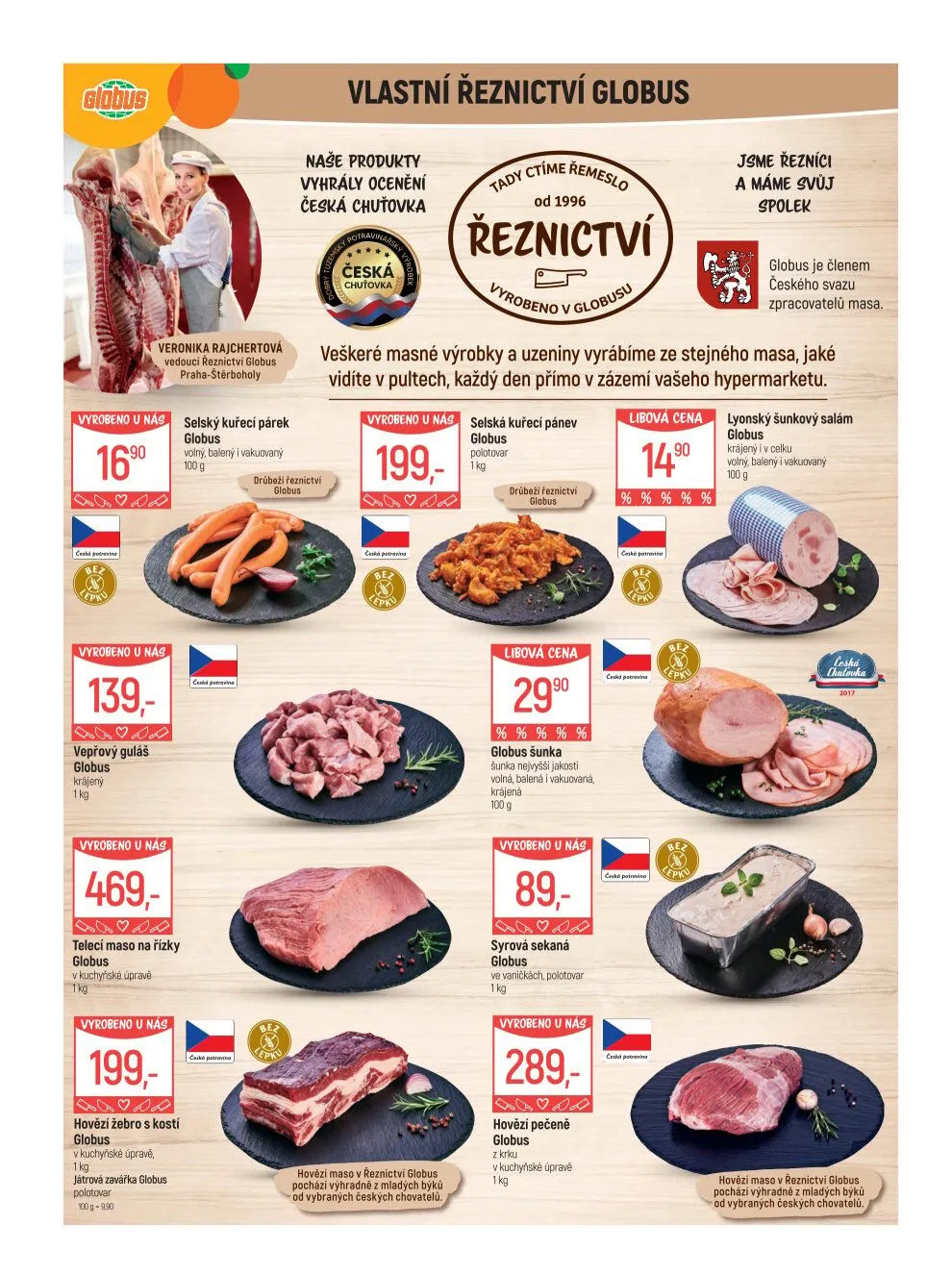 V našem řeznictví Globus ctíme tradiční řemeslo a nabízíme široký výběr kvalitních masných výrobků a uzenin. Od roku 1996 jsme hrdými členy Českého svazu zpracovatelů masa. Naše produkty, jako jsou selské kuřecí párky, vepřový guláš, telecí maso na řízky a hovězí žebro s kostí, jsou vyráběny přímo v zázemí hypermarketu z masa, které vidíte na pultech.
